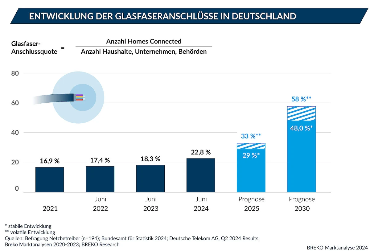 Die Breko Marktstudie verwies im April 2025 beim Ausbaustand (Homes passed) auf 48,8 Prozent, bei 24,5 Prozent angeschlossenen Haushalten (Homes Connected / Zahl der Haushalte).