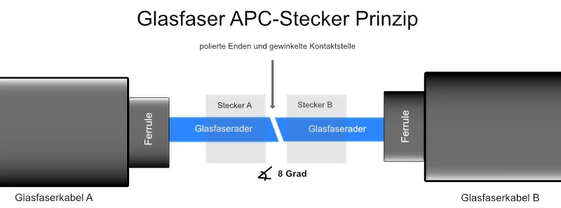 Bei diesem Typ sind die Kabelenden je leicht gewinkelt geschliffen. Man kann sich das wie zwei Fußleisten-Ecken vorstellen, die Kante auf Kante liegen. Daher auch der Name APC für „angled physical connect“, also „gewinkelter Kontakt“. Der Winkel beträgt übrigens meistens 8 Grad. Durch den Schrägschliff werden an den Kabelenden weniger Rückreflektionen als am PC-Schliff erzeugt, was zu geringerer Signalstörung führt.