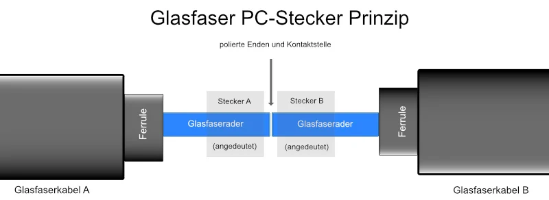 Bei blau markierten handelt es sich um sogenannte PC-Stecker. Das hat nichts mit dem Computer zu tun, sondern bedeutet „physical contact“. Bei dieser Bauform werden die fiberoptischen Fasern sozusagen horizontal aneinandergelegt, wie Endstücke eines Zylinders mit gleichem Durchmesser. Natürlich gibt es immer einen winzigen Luftspalt dazwischen, der zu einer Dämpfung führt. Je exakter und kleiner dieser auffällt, desto geringer fällt der Dämpfungsverlust aus. Das folgende Bild zeigt schematisch die Kopplungsweise des PC-Steckers.