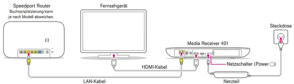 Wer zu seinem Glasfaser Tarif noch Magenta-TV gebucht hat, kann noch die TV-Box mit dem Internet verbinden. In der Regel erfolgt dies per LAN-Kabel. Dazu wie gewohnt einen freien Port am Router mit dem LAN-Port an der Box verbinden und anschalten. Folgend Sie nun den Anweisungen. Wer kein Kabel legen möchte, bindet die die TV-Box optional per WLAN an. Eine Alternative wären im Handel erhältliche DLAN-Adapter, wo im Haus das Stromnetz praktisch als eine Art Internetleitung benutzt wird.